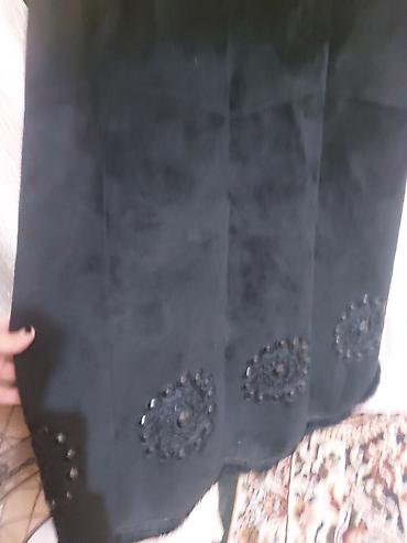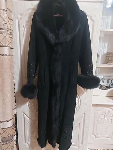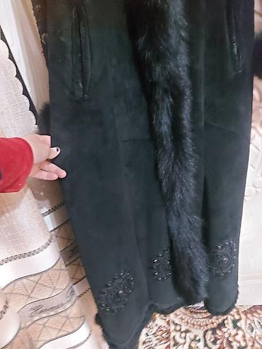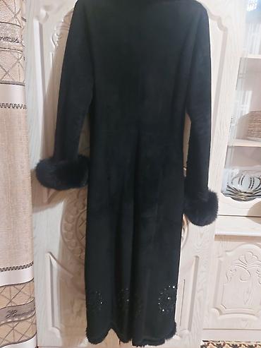 Длинная женская дублёнка/пальто из чёрной замши с натуральным мехом.