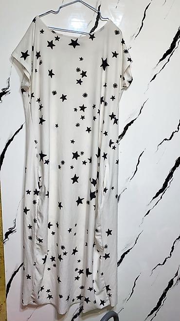 2) Платье свободного кроя, светлое с принтом чёрных звёзд. Спущенная линия плеч, короткий рукав. Длина миди, по бокам — карманы. Мягкая струящаяся ткань.