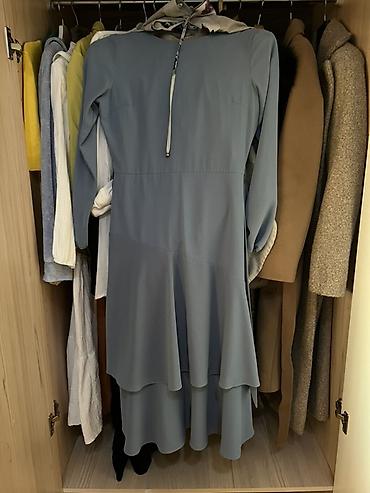- Платье однотонное голубое миди. Закрытый круглый вырез, длинные рукава, многоярусный асимметричный низ-воланы. На вороте декоративная завязка-лента/шнур.