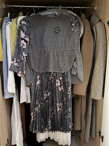 - Комплект: серый жилет на застёжке/потайной обработке + платье с цветочным принтом. Платье с плиссированной юбкой миди и подкладкой по низу, рукав 3/4. На жилете декоративная брошь.