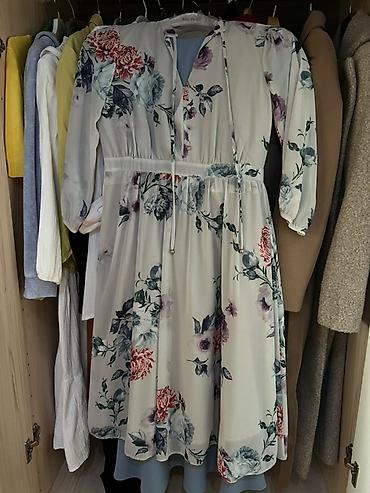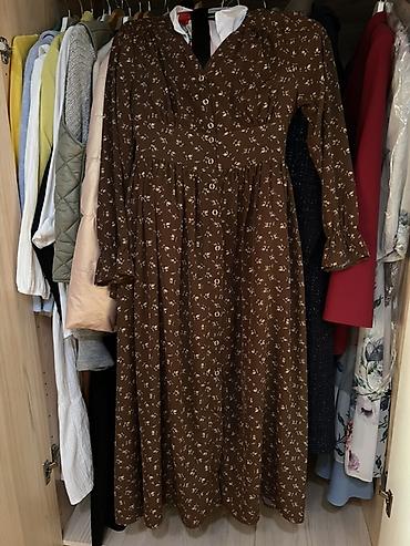 - Платье коричневое миди с мелким светлым принтом. V-образный вырез, ряд пуговиц по всей длине, завышенная линия талии со сборкой, длинный рукав с лёгким клёшем у манжеты.