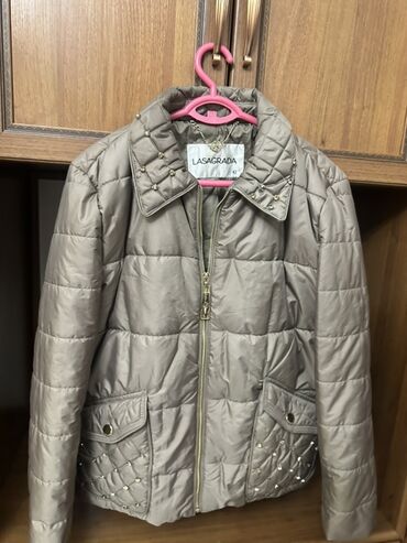 Практичная межсезонная модель с аккуратным блеском и декоративной фурнитурой — подойдёт к джинсам и повседневным образам, а также к более женственным комплектам. Размер на бирке: 42.