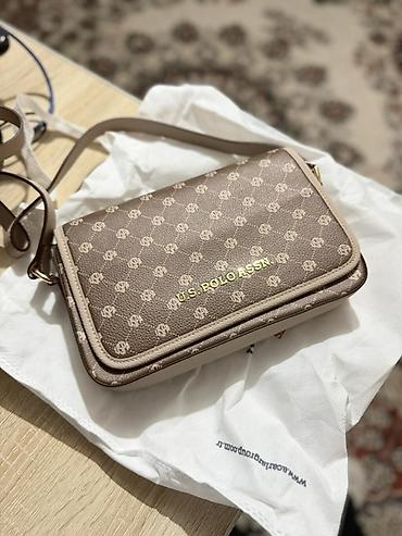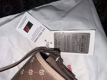 - Цвет: бежево-коричневый (тауп), фирменный монограммный принт USP по всей поверхности, золотистый логотип U.S. POLO ASSN. спереди