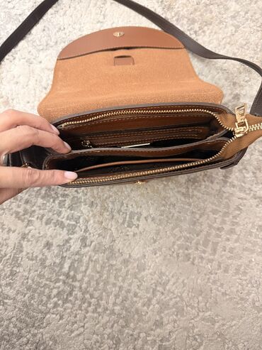 - Карманы: внешний задний карман на молнии; внутреннее отделение под клапаном (видны ярлыки/бирки сбоку).