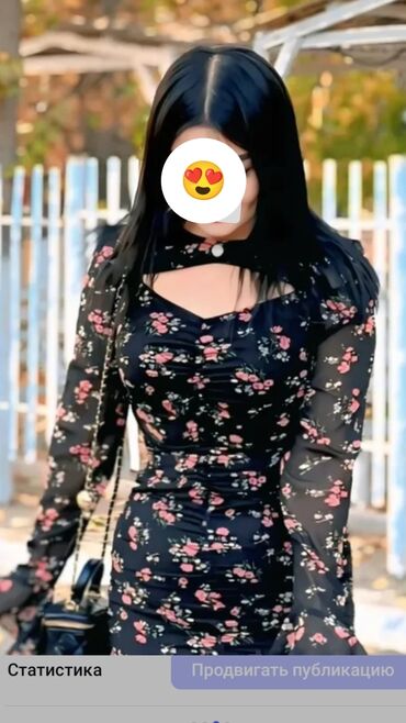 - Платье в цветочный принт: чёрная основа с розово-зелёным флоралом, облегающий силуэт с драпировкой, длинные полупрозрачные рукава, вырез с декоративной вставкой и маленькой пуговицей на горловине. Женственный образ на каждый день и для выхода.