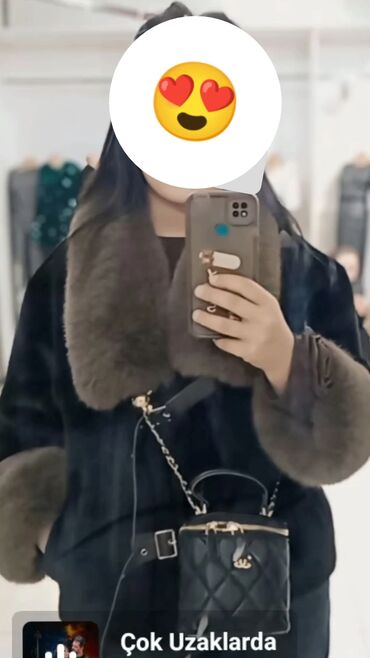 - Шубка/полушубок с меховой отделкой: чёрный верх с широким пушистым воротником и манжетами в контрастном дымчато-коричневом мехе, поясной ремень с пряжкой, скрытая застёжка. Тёплая и эффектная верхняя одежда.