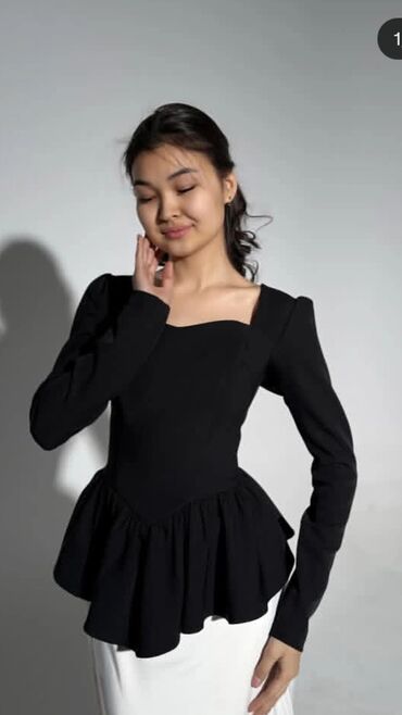 - Жакет-блуза с баской: плотный чёрный материал, квадратный вырез, длинные рукава, подчёркнутая линия талии и пышная баска по низу. Универсально сочетается с юбками и брюками.