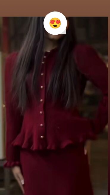 - Вязаный кардиган с баской: глубокий бордовый цвет, ряд декоративных пуговиц спереди, мягкая фактура, фигурный волнистый край по низу и манжетам. Акцентирует талию и добавляет объём внизу.