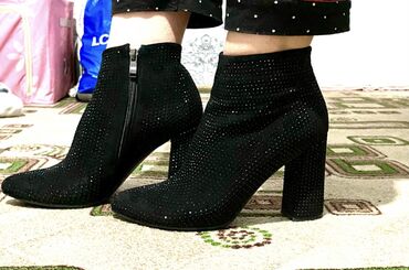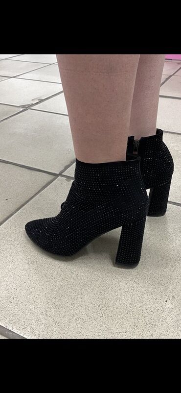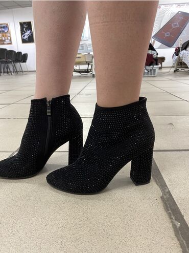 Женские ботильоны-носки, черные, с мелкими сияющими стразами по всему верху. Материал внешней части — бархатистый (велюр/замша на ощупь). Удобная колодка с заострённым мысом и устойчивым высоким квадратным каблуком. Боковая молния для быстрого надевания. Плотно облегают щиколотку, визуально стройнят ногу. Универсальная модель для выхода и повседневных образов: отлично сочетается с платьями, юбками и джинсами. Подошва с небольшим протектором, каблук обтянут в тон. Цвет фурнитуры — темный металл.