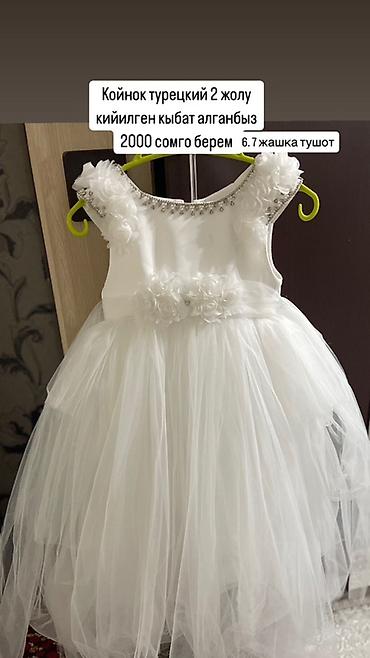 - Белое нарядное детское платье (Турция): верх с цветочными аппликациями и декоративным камневым кантом по вырезу, пышная многослойная фатиновая юбка, пояс с розочками. Подходит на 6–7 лет. Цена: 2000 сом.