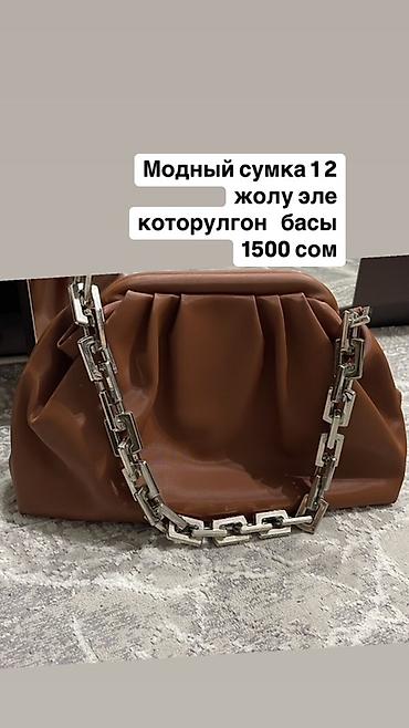 - Стильная женская сумка цвета карамель/коричневый с массивной серебристой цепью-ремнём. Мягкий мешковатый силуэт с драпировкой. Цена: 1500 сом.