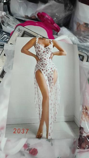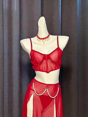 - Комплектация: бюстье с тонкими бретелями, трусики и длинная полупрозрачная юбка/пеньюар с высокими разрезами. На красной версии — декоративные цепочки из бусин по линии талии; бюстье с каркасной формой чашек и центральной застёжкой/вставкой.