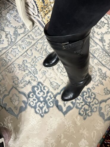 - Высокие сапоги-чулки до колена, черные: гладкая кожа, закругленный мыс, небольшая плоская подошва; верх оформлен ремешком с пряжкой