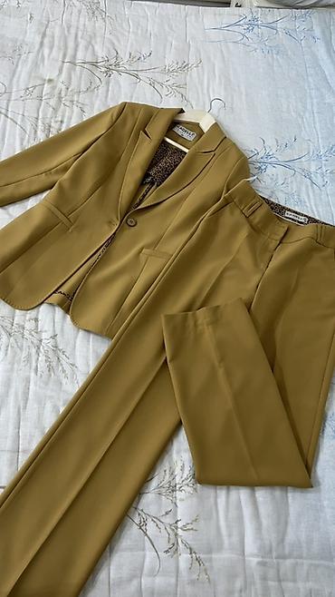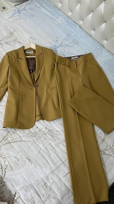 Женский костюм-двойка в горчичном оттенке: приталенный жакет + прямые