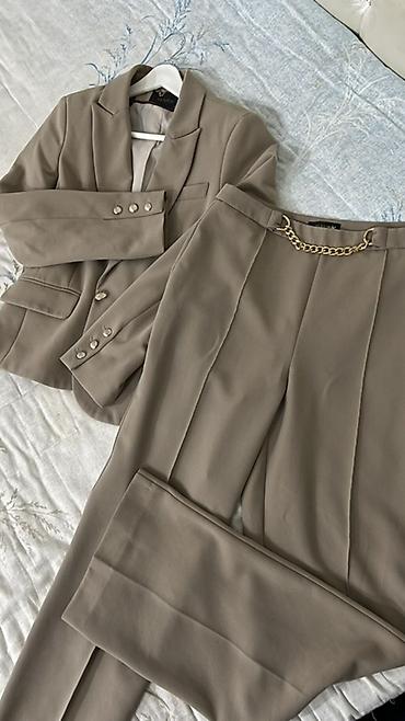 Женский костюм-двойка в бежево-оливковом оттенке.