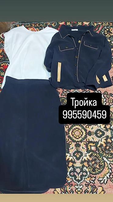 - Женский комплект «тройка»: белая базовая блуза без рукавов, темно‑синий укороченный жакет на пуговицах с контрастной бежевой окантовкой и декоративными вставками, темно‑синяя юбка миди прямого кроя. Универсальный вариант для офиса и повседневных образов, легко комбинируется между собой и с другими вещами.