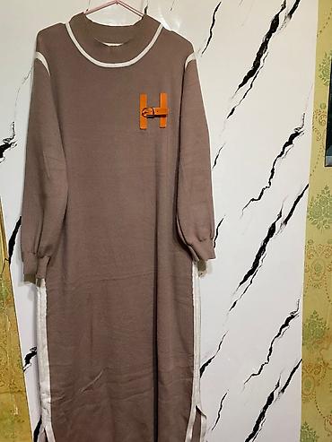 - Трикотажное платье миди кофейного оттенка с белой отделкой по горловине и бокам, длинным рукавом и разрезами по бокам. На груди декоративная нашивка в виде буквы H с ремешком. Подходит для комфортных повседневных образов.
