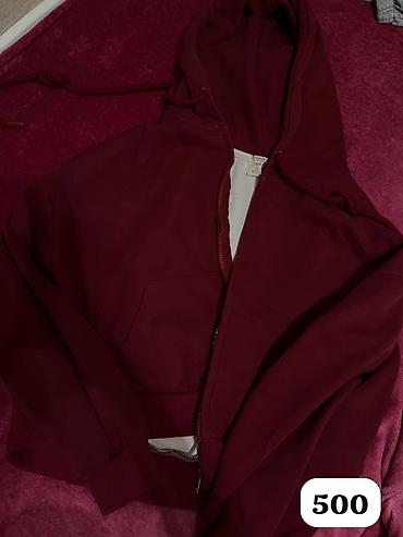 - Бордовое худи на молнии с капюшоном и шнурками, кенгуру‑карманом и плотными трикотажными манжетами/низом. На фото указана цена: 500.