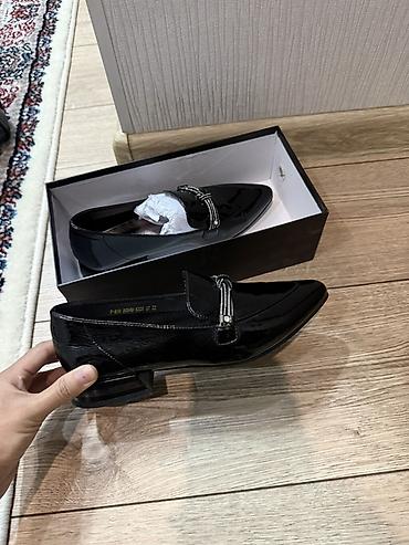 4) Лоферы чёрные лакированные, заострённый носок, невысокий фигурный каблук, перемычка с металлическим декором/молнией на подъёме. Поставляются в коробке.