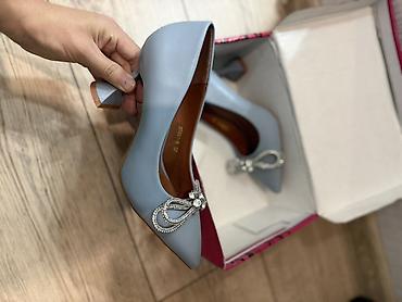1) Туфли-лодочки голубые на устойчивом каблуке средняя высота. Заострённый мыс, декор на мыске в виде брошки со стразами. В комплекте фирменная коробка.