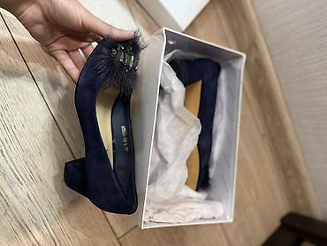 3) Туфли тёмно-синие на среднем широком каблуке. Бархатистая фактура, украшение на мыске: пушистый помпон с крупным кристаллом и камнями. В коробке с бумагой-вкладышем.