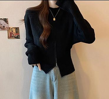 - Черный кардиган-джемпер с фактурной вязкой и двусторонней центральной молнией: можно носить как закрытым, так и приоткрывать снизу для акцента на талии.