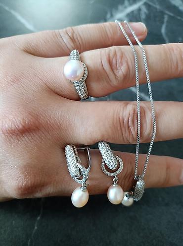 Элегантный ювелирный набор, включающий колье, кольцо и серьги, украшенные искусственным жемчугом и мелкими блестящими камнями. Колье имеет тонкую цепочку и подвеску с жемчужиной. Серьги-подвески и кольцо выполнены в едином стиле, дополняя образ. Этот набор идеально подходит для создания утонченного и завершенного образа.