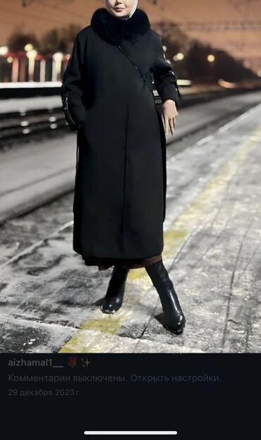 Длинное черное пальто в минималистичном стиле.
