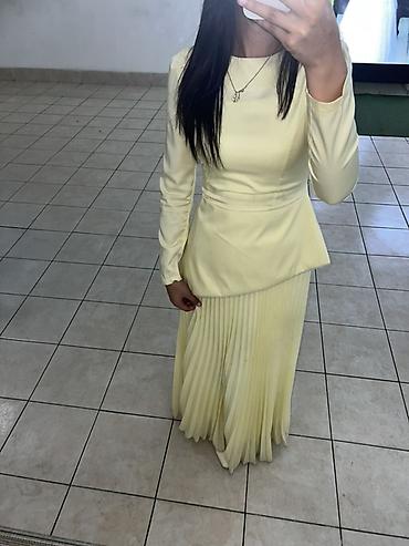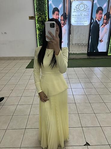 Двойка, юбка и кофта с завязками нежно‑лимонного цвета с длинным рукавом и закрытым круглым вырезом. Верх с мягкими подплечниками и акцентированной линией талии, асимметричная баска визуально формирует силуэт «песочные часы». Юбка плиссированная, струящаяся, длина в пол. Ткань гладкая с легким сатиновым отливом, держит форму, комфортная для торжеств и мероприятий. Универсальный элегантный фасон, сочетается с лодочками и минималистичными украшениями. Отличный вариант для свадьбы в качестве гостя, выпускного, вечернего выхода или семейной фотосессии.