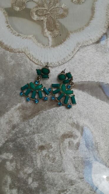- Серьги 2: яркие, подвесные. Зеленые вставки и голубые кристаллы, веерная композиция, крепление-гвоздик.