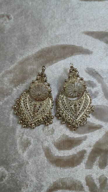 - Серьги 1: крупные, подвесные, под старинное золото. Ажурный орнамент с множеством мелких бусин по краю.