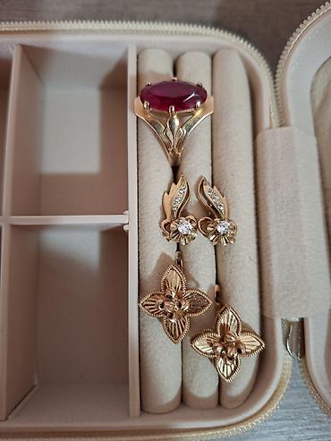 - Вставки: один крупный овальный камень красного цвета в кольце; прозрачные камни в одной паре серег.