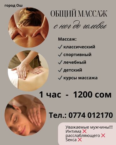Массаж - звонить с 08:00 - 20:00 лечебный массаж общий массаж с ног до головы. 1 час - 1200 сом лечебно-оздоровительный массаж для мужчин и для женщин. Массаж остеохондроза (шейн...