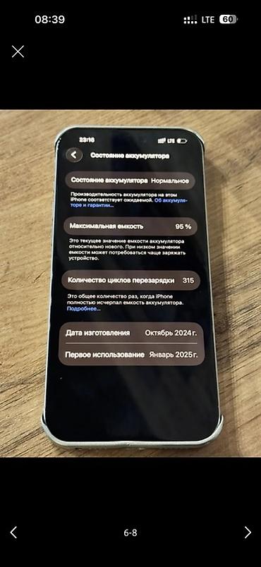 - На экране видна информация из настроек аккумулятора: максимальная ёмкость 95%, количество циклов перезарядки 315, состояние аккумулятора — нормальное. Дата изготовления — октябрь 2024 г., первое использование — январь 2025 г.
