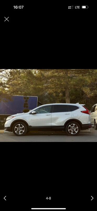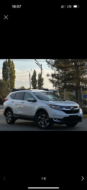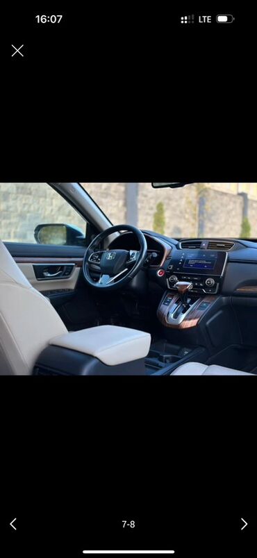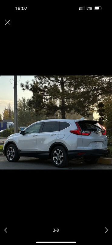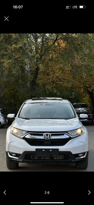 Honda CR‑V, белый кроссовер (поколение с характерной решёткой и фарами с LED-ходовыми огнями). Просторный салон с двухцветной отделкой: светлые сиденья и вставки под дерево на панели и тоннеле. Мультируль, кнопка Start/Stop, большой центральный экран мультимедийной системы, климат‑контроль, автоматическая коробка с удобным селектором, электроручник, подлокотник и множеством ниш для хранения.