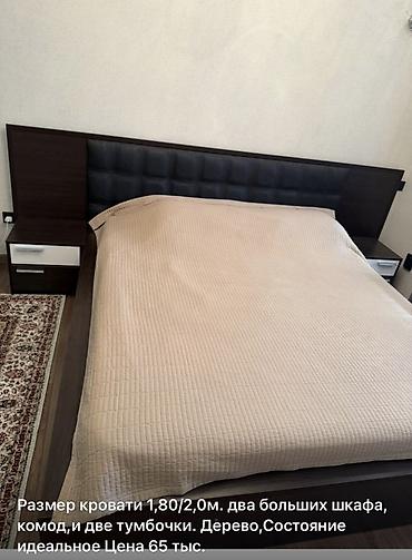 - Двуспальная кровать 1,80 × 2,0 м с высоким изголовьем, мягкая панель в обивке, широкий корпус из темного шпона.