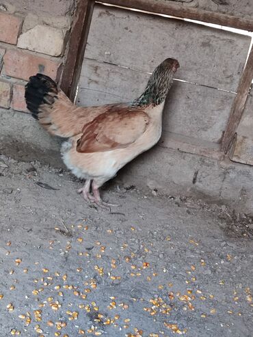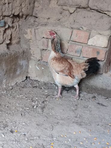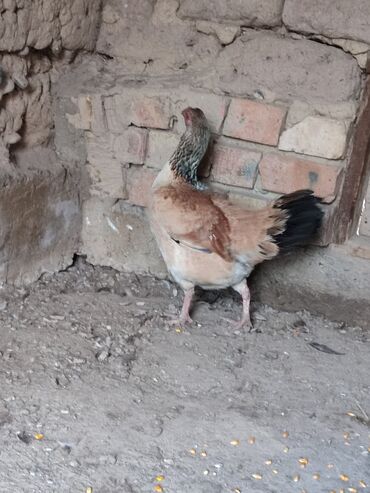 Курица домашняя, легкого бойцового/дворового типа. Окраска пшеничная с черным хвостом, грудь светлая, шея с пестрым «ожерельем». Стройное телосложение, длинные ноги, приподнятая посадка хвоста. Гребень малый, листовидный, лицо красное. На фото птица в рост, профиль и вид со спины — можно оценить корпус, крылья и оперение.