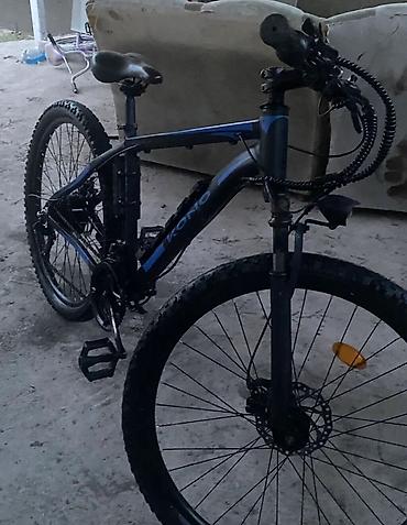 Электровелосипед горный KONO, алюминиевая рама 29"/27.5" (визуально крупные колёса), цвет черный с синими вставками.