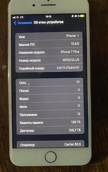 На фото экрана: раздел «Об этом устройстве» подтверждает модель iPhone 7 Plus, номер модели MPQV2LL/A, емкость хранилища 128 ГБ, доступно около 105,7 ГБ. Показано рабочее сканирование отпечатка пальца (настройка Touch ID).