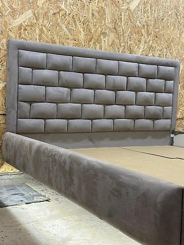 - Изголовье: мягкая панель с объемной «кирпичной» стежкой, строгая рамка по периметру.