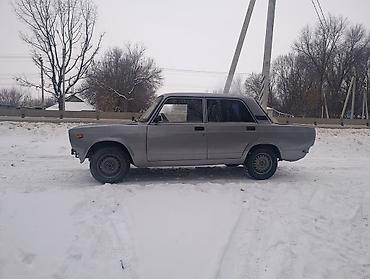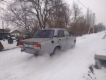 ВАЗ 2107, седан, серый цвет. Кузов классической «семёрки» с четырьмя дверями, окраска однотонная. На фото установлены штампованные стальные диски с зимними шинами, тонированные задние и боковые стёкла, наружные зеркала в чёрном цвете.
