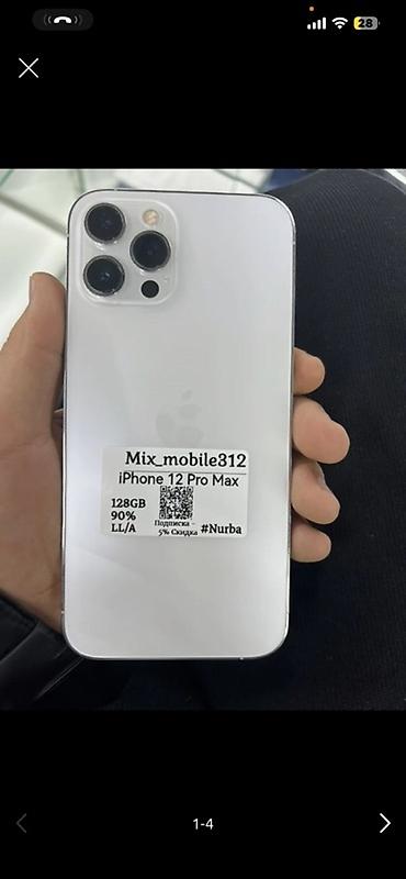 На наклейке: «Mix_mobile812», «iPhone 12 Pro Max», «128GB», «90% LL/A», хэш-тег «#Nurba», QR-код и надпись «Подписка — 5% скидка».
