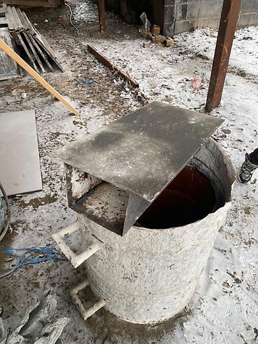 - Металлическая бочка с крышкой‑лотком и ручками — может использоваться как емкость для замеса/отстаивания раствора, воды либо для технологических нужд на площадке.