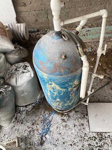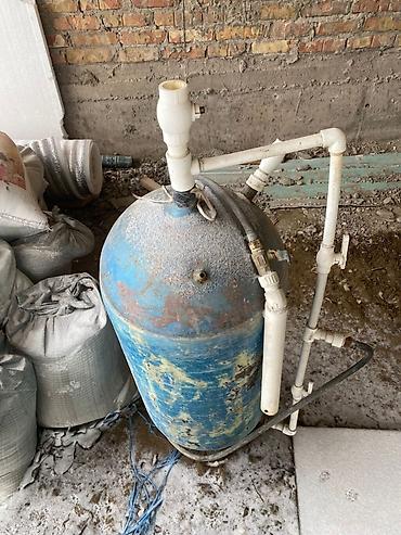 - Вертикальная емкость с обвязкой из ПВХ-труб (гидроаккумулятор/бак) — для подачи воды к рабочему месту или использования в технологическом цикле.