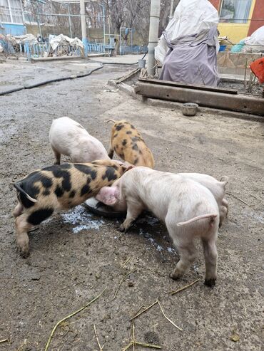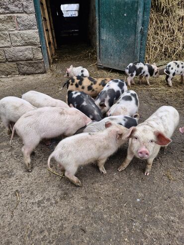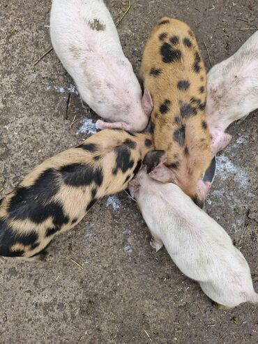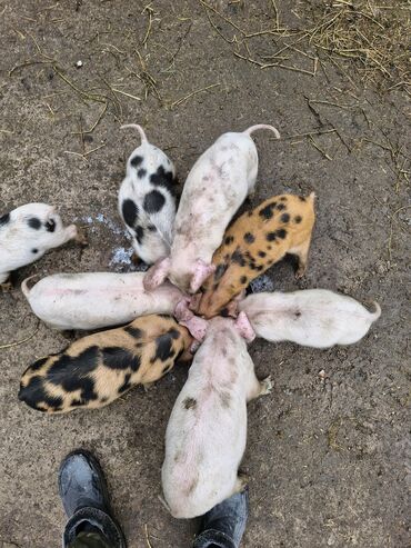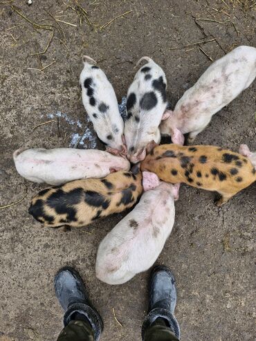 Поросята разного окраса (белые, пятнистые черно-белые и рыже-пятнистые). На фото — молодняк из одного выводка, активный, ровный по размеру.