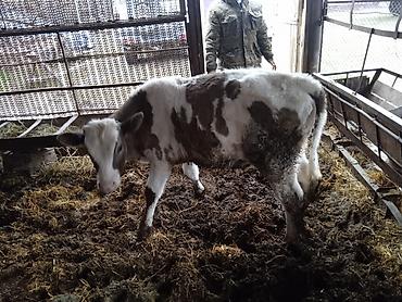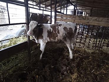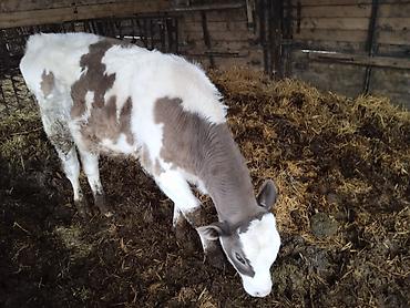 Телёнок (бычок), пёстрой масти (коричнево-белый). - Возраст по виду: молочный/подросток. - Крепкая конституция, ровные ноги. - Рога не выражены, на голове недоуздок. - Кормление: ест дроблё...