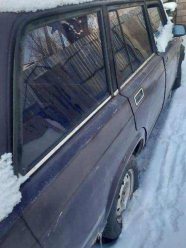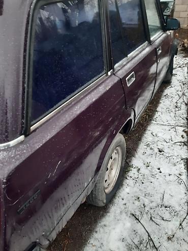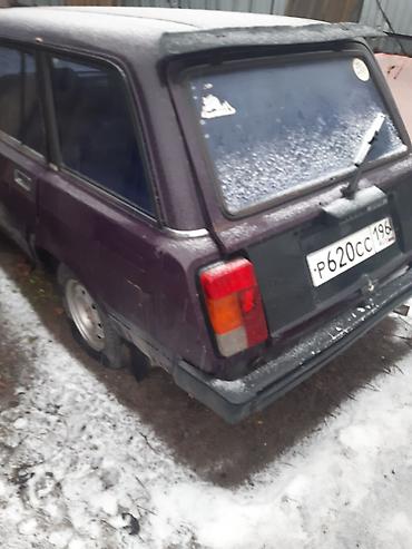 Продаётся автомобиль универсал ВАЗ (семейство 2104/2105/2107). Кузов темно‑фиолетовый, задний привод. На крыше установлен спойлер над задней дверью. Окна тонированные по кругу. Стальные штампованные диски. Снаружи — пластиковые бампера, хромированные молдинги по линиям окон и дверей, боковые зеркала классической формы.