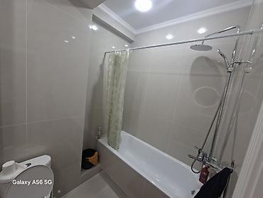 - Санузел совмещённый: ванна с шторкой, подвесная тумба с умывальником, круглая зеркальная подсветка, стиральная машина, бойлер для автономного горячего водоснабжения.