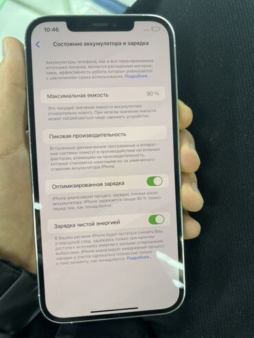 - Состояние аккумулятора по iOS: максимальная ёмкость 90%, включены «Оптимизированная зарядка» и «Зарядка чистой энергией».