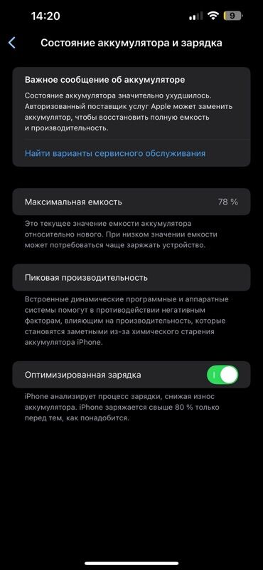 «Состояние аккумулятора»: максимальная ёмкость 78%, отображается уведомление о необходимости обслуживания аккумулятора. Опция «Оптимизированная зарядка» включена.